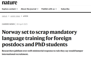 Dette skriver Nature i en artikkel om regjeringens forslag om å fjerne krav til språkopplæring for stipendiater og postdoktorer. Les hele artikkelen her.