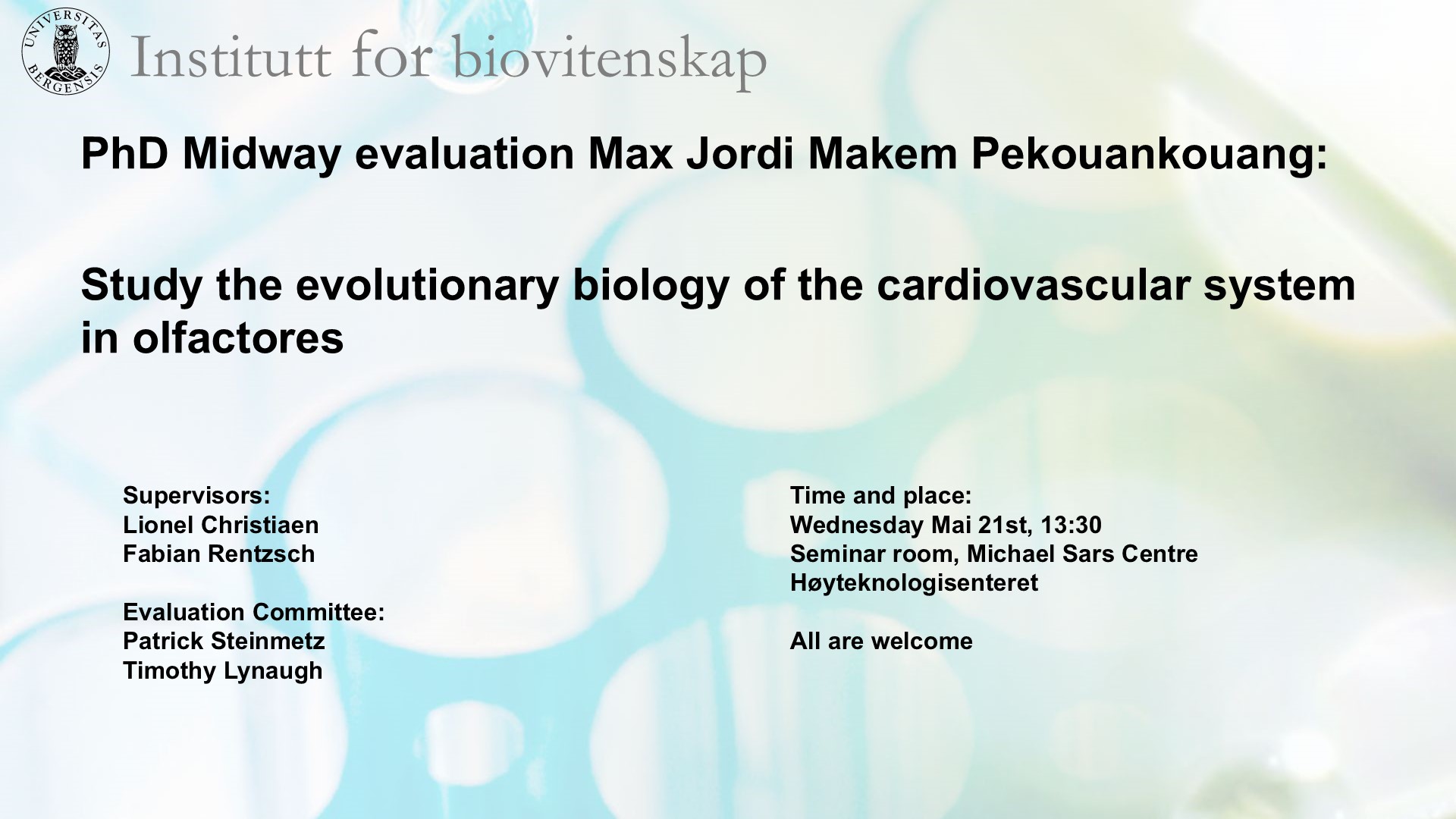 BIO kalender, BIO Nyheter, Forskerutdanning Ons 21 mai. Ph.d. midtveispresentasjon, Max Jordi Makem Pekouankouang 16. mai 2025 Study the evolutionary biology of the cardiovascular system in olfactores 13.30-14.15 Seminarrommet, Michael Sars senteret, 2et Bioblokken, Høyteknologisenteret
