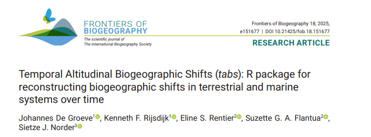 Groeve, J.D., Rijsdijk, K.F., Rentier, E.S., Flantua, S.G.A., Norder, S.J., 2025. Temporal Altitudinal Biogeographic Shifts (tabs): R package for reconstructing biogeographic shifts in terrestrial and marine systems over time. Frontiers of Biogeography 18, e151677. https://doi.org/10.21425/fob.18.151677
