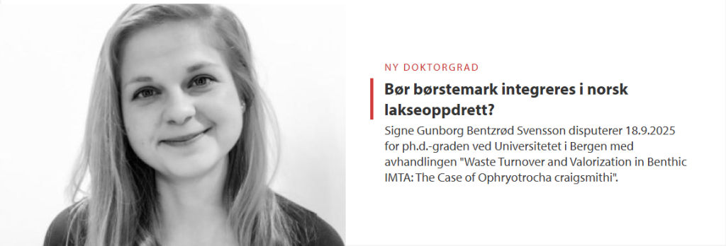 BIO kalender, Forskerutdanning Tor 18. sept. Signe Gunborg Bentzrød Svensson disputerer! 12. september 2025 Waste Turnover and Valorization in Benthic IMTA: The Case of Ophryotrocha craigsmithi 9:15 – 12:00 Auditoriet, VilVite, Thormøhlens gt 51 Les Signes pressemelding