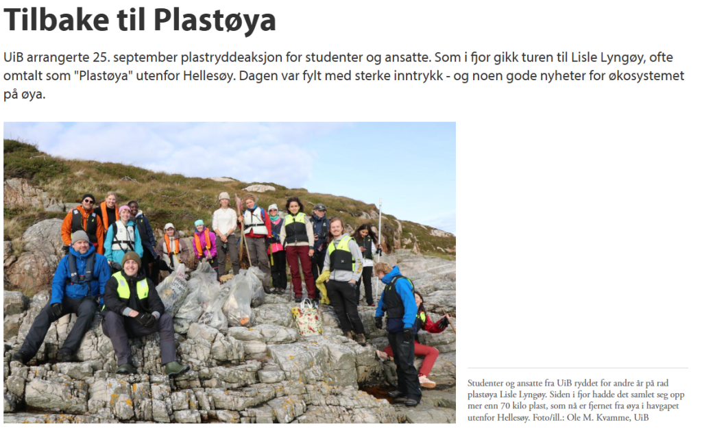 UiB arrangerte 25. september plastryddeaksjon for studenter og ansatte. Som i fjor gikk turen til Lisle Lyngøy, ofte omtalt som «Plastøya» utenfor Hellesøy. Dagen var fylt med sterke inntrykk – og noen gode nyheter for økosystemet på øya.