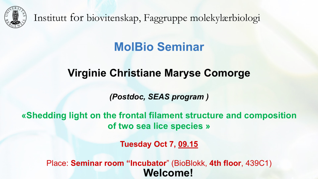 Ingen kategori MolBio seminar Med Virginie Comorge tirsdag 7. oktober 3. oktober 2025 Shedding light on the frontal filament structure and composition of two sea lice species Rom 439C1 (Inkubatoren), 4. et, Bioblokken, TM55 9.15 – 10.00