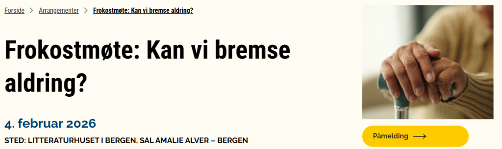 Frokostmøte 4. februar – Bergen: Kan vi bremse aldring? Bioteknologirådet inviterer til frokostseminar om spennende og aktuell forskning på NAD, aldring og hjernesykdommer. Charalampos Tzoulis, professor i nevrologi ved Haukeland universitetssykehus og Universitetet i Bergen, kommer til Litteraturhuset i Bergen for å fortelle om forskning på aldring og hjernesykdommer. Han vil blant annet belyse molekylære mekanismer som er sentrale for aldring og hjernesykdom, inkludert mitokondriefunksjon og cellenivåer av nikotinamid adenin dinukleotid (NAD), og om denne kunnskapen kan brukes til å utvikle nye behandlinger som bremser naturlig aldring eller forebygger aldringsrelaterte hjernesykdommer. Tid: kl. 08.30-09.15 onsdag 4. februar Sted: Litteraturhuset i Bergen, sal Olav H. Hauge og på strømming Møtet er åpent for alle (gratis) og vil bli strømmet. Det tilbys lett servering.