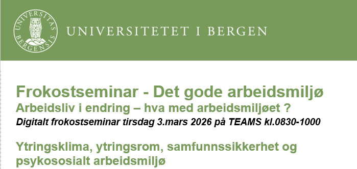 Gjennom frokostseminarserien Arbeidsliv i endring – hva med arbeidsmiljøet? ønsker vernetjenesten ved UiB å sette søkelys på betydningen av faktorer som bygger et godt arbeidsmiljø.