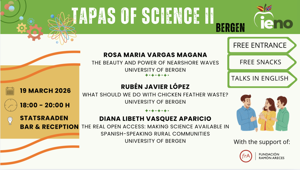 Next Thursday 19 March, a new edition of Tapas of Science will take place in Bergen. The event offers a relaxed opportunity to learn about exciting research projects while enjoying some snacks and good company.
