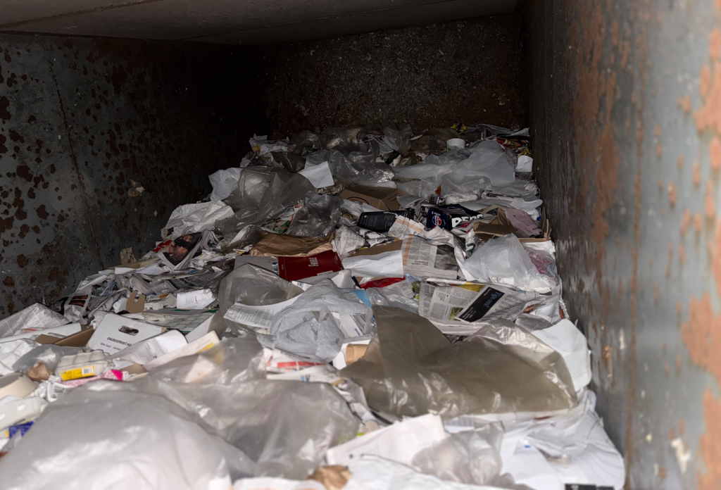 Vi har fått melding fra driftsleder hos GC Rieber om at det er mye plast avfallet som kastes via avfallssjaktene for papir, se bildet. Det kan både være at det kastes plast i sjaktene, eller det kan være at papir som kastes er pakket i plastposer.