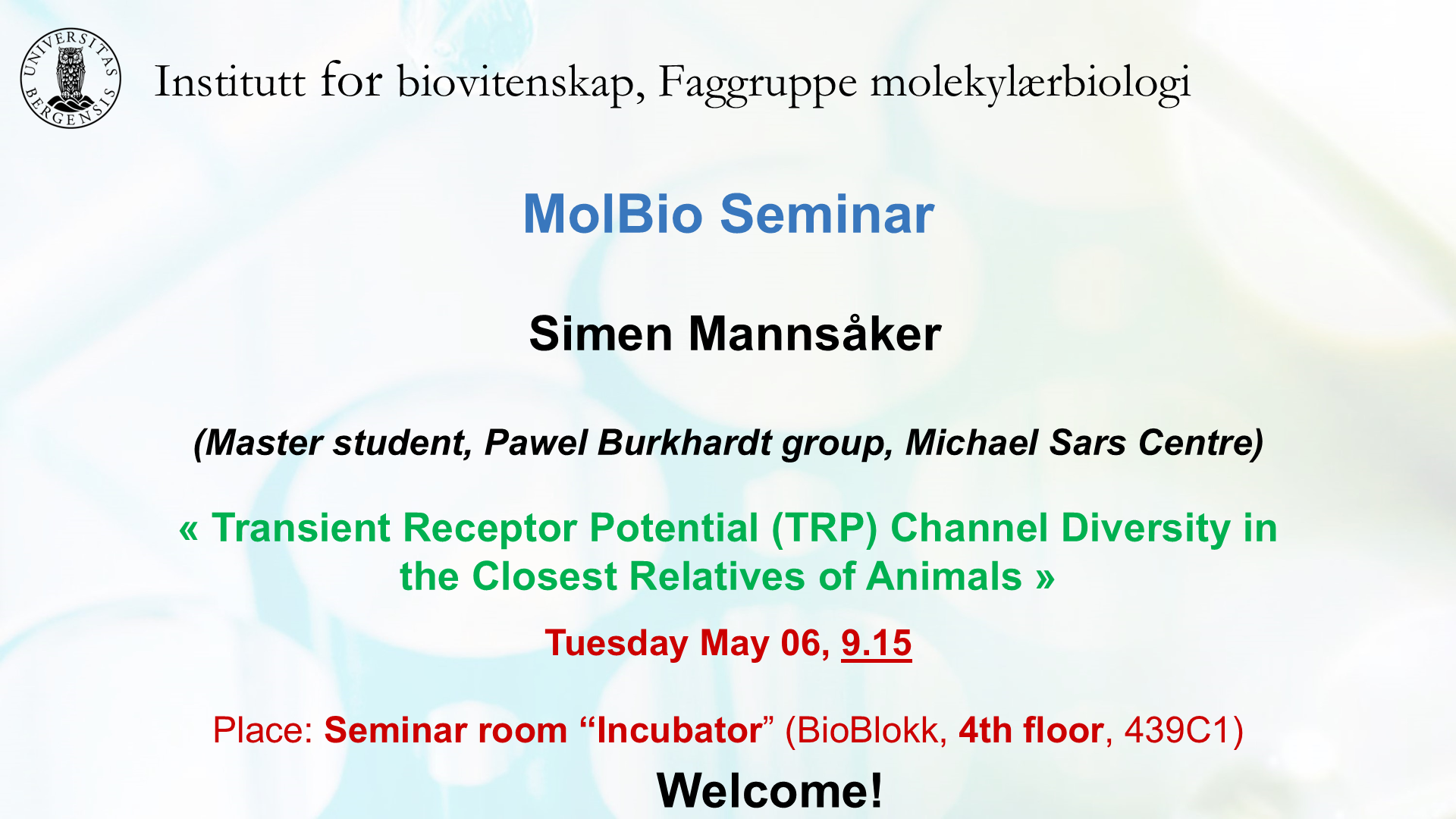 BIO Calendar, BIO News Tue 8.5.2025 – MolBio seminar by Simen Mannsåker 2. May 2025 Transient Receptor Potential (TRP) Channel Diversity in the Closest Relatives of Animals 9.15-10.00 The Incubator (room 439C1), 4th floor, Bioblokken, Høyteknologisenteret