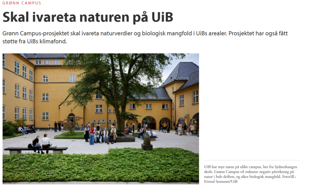 The Green Campus project aims to safeguard natural values and biodiversity in UiB’s areas. The project has also received support from UiB’s climate fund. A steering committee [“Grønt utvalg”] has been appointed to coordinate the project: